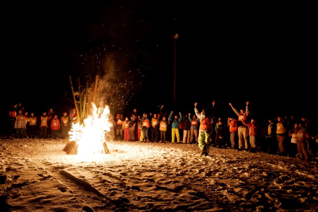 昨日からの湿った雪の影響で、地面だけでなく木々も真っ白に染まった3日目の朝。子ども達の願いが届きお天気にも恵まれ、待ちに待った雪遊びです。ただ雪があるだけで、子どもの遊びは無限に広がり、時間も寒さも忘れて楽しんでいました。また、昨日作った竹灯籠の設置は、規則性なく散らばるように、広がるように・・・。約150個の灯籠に灯りが灯ると、とても幻想的な光景が広がりました。そして、最終夜の締めくくりは、恒例のキャンプファイヤーで大盛り上がり。楽しい時間はあっという間に過ぎてしまいますね。