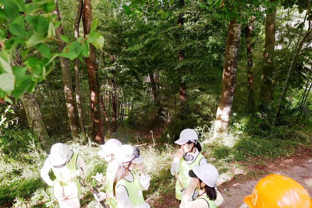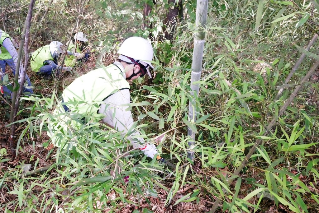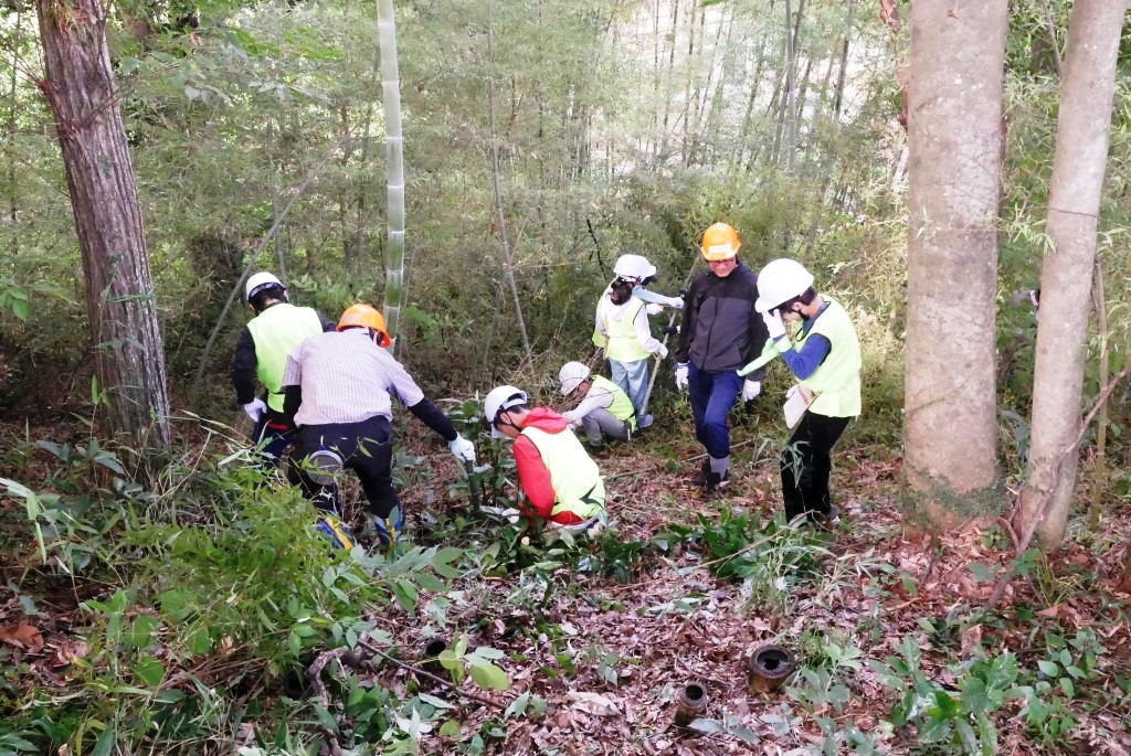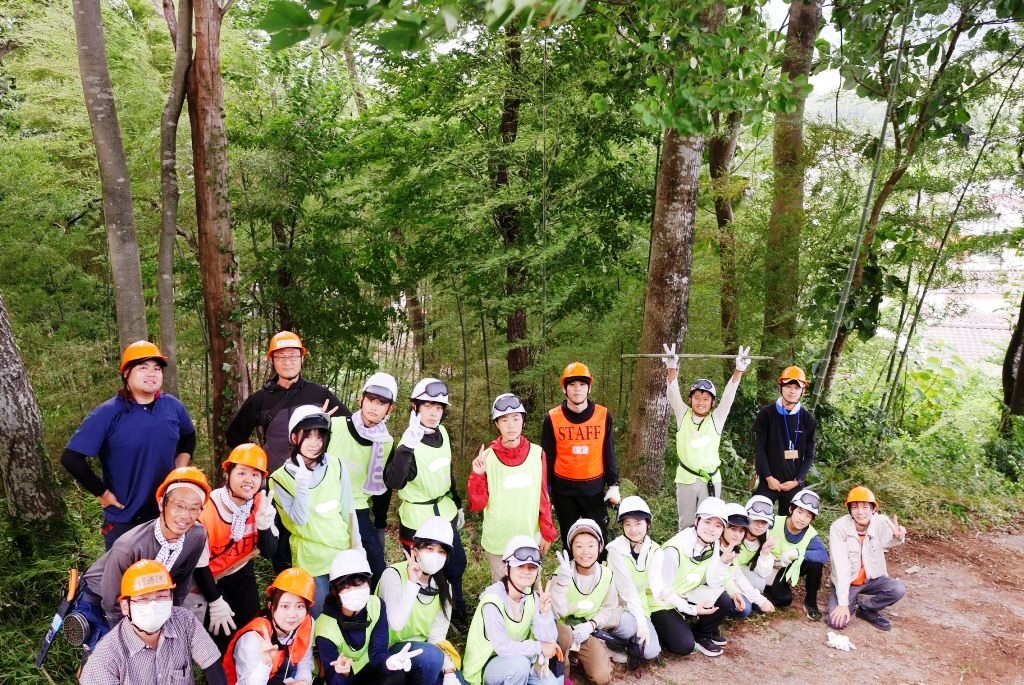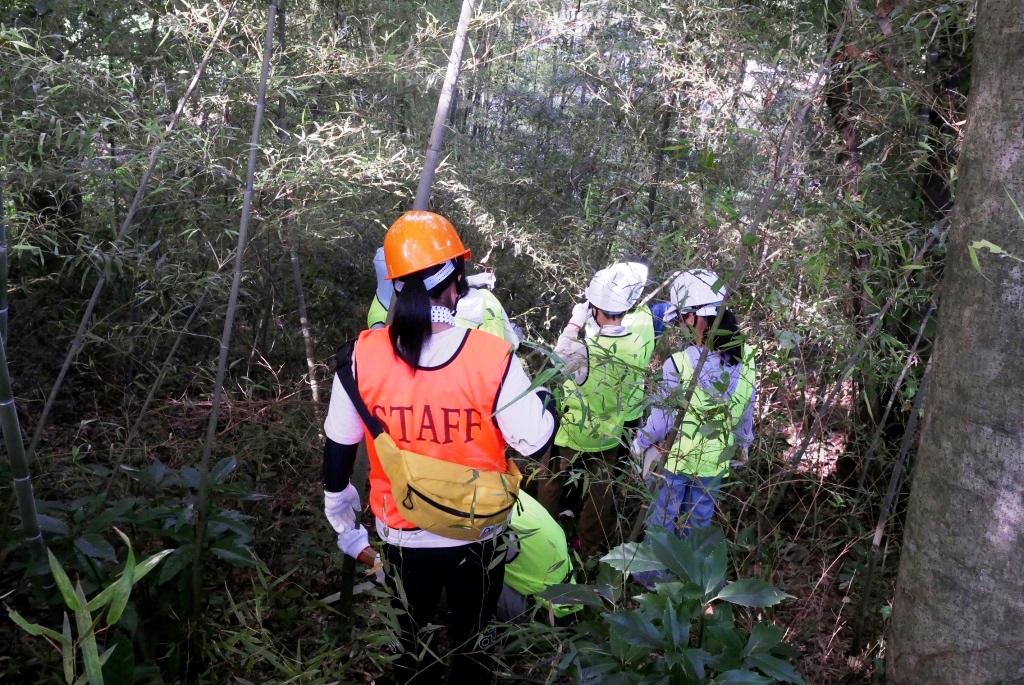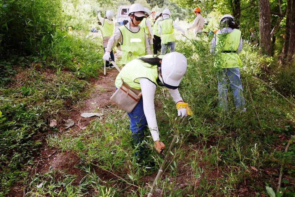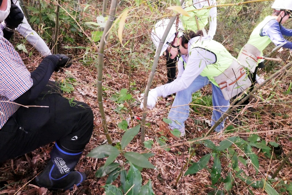 川場まるごと滞在記の初日は、村内の中心部にある後山(うしろやま)での活動からスタートです。毎年この後山をフィールドに様々な活動を行っておりますが、今回は竹林の整備作業を行いました。実はこの場所は、数年前に全て伐採して綺麗にしたのですが、竹は生長が早いため数年であっという間に生い茂ってしまいました。そこを綺麗にすることで見通しが良くなるため、獣害対策に繋がります。短い時間の作業でしたが、中高生のパワーであっという間に綺麗になり、その景色からも達成感を感じられたようです。地元の人も大助かりですね。