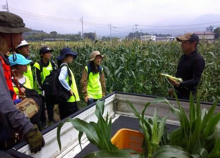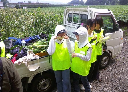 2日目は、毎年お世話になっている農家・小林さんのお手伝いです。小林さんは、川場村が誇るブランド米「雪ほたか」の生産者でもあり、米・食味分析鑑定コンクール国際大会で、毎年金賞を受賞しています。それだけでも凄いことですが、なんと「世界最高米」の原料米にも選ばれ、日本だけでなく世界トップレベルのお米を作る、若手農家さんです。そんな小林さんのところで、トウモロコシ畑の除草作業と収穫体験をさせていただき、トウモロコシの収穫体験後には、もぎたてのトウモロコシをその場でかじるという貴重な体験もさせていただきました。