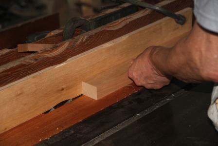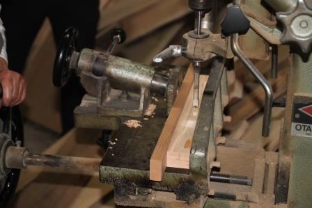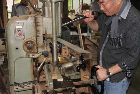 そのために、前後の脚に墨を付けて、穴あけを行います。穴あけは、出来上がりを左右する大事な工程です。