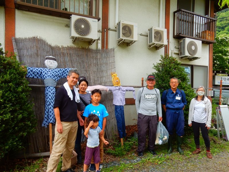 翌日は雨の中でしたが、秋に向け棚田にたてる案山子を思い思いに作り、それぞれ特徴的で素敵な案山子が出来ました。稲刈り前の田んぼの様子が楽しみです。