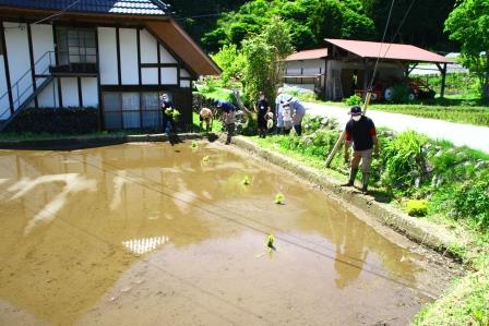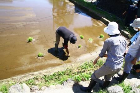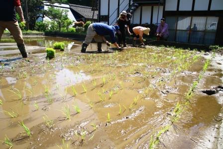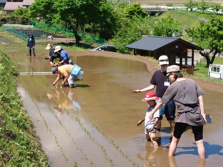 作業中は、泥に脚を取られ転びそうになる方がいたり、泥独特の感触に子ども達は大はしゃぎ。また、田植え後には丁寧に手植えされた苗が並び、参加者も秋の収穫を楽しみにされている様子でした。
