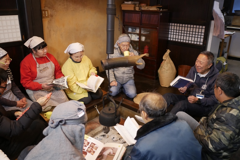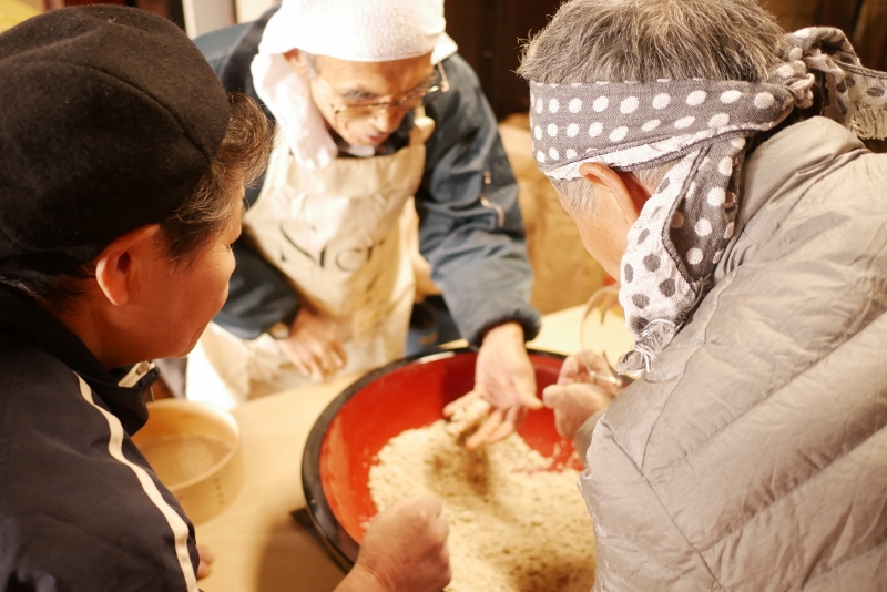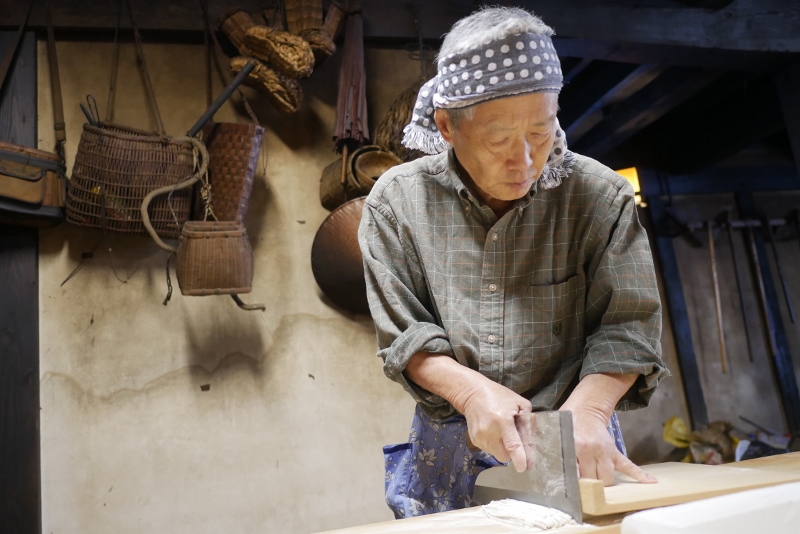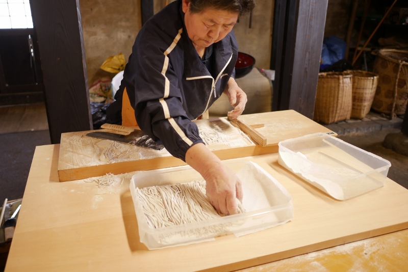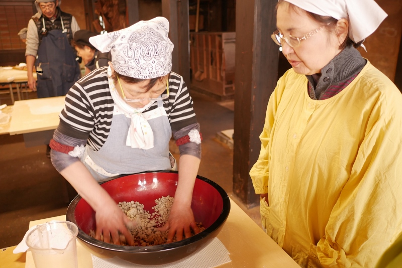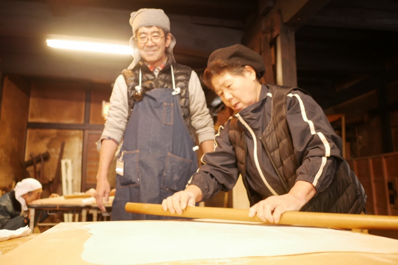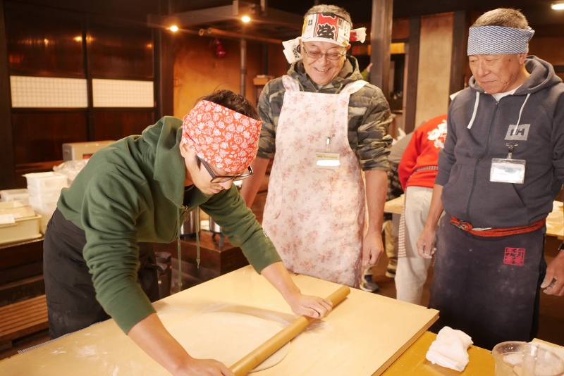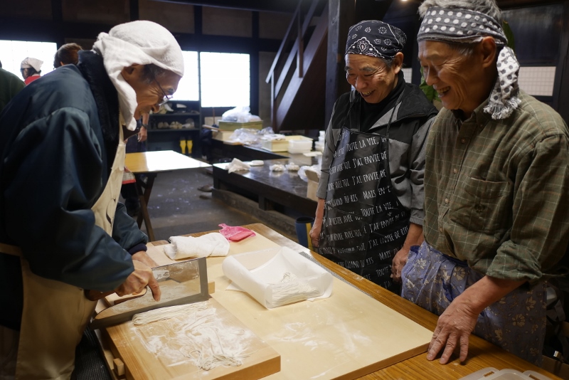 今回は、地元のそば打ち名人に地元の粉と水を使ったそば打ちを披露していただきました。参加者の皆さんは、名人のそば打ちを目の当たりにし、「職人技」に目が釘づけになっていました。