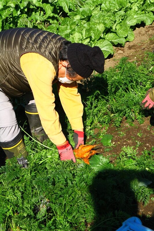 今回で2020年度の最終回を迎えました。最終回は両日ともに晴天の収穫日和となりました。白菜・ねぎ・だいこん・にんじん・野沢菜・蕪等の沢山の収穫を行う事ができ、皆さん、持ち帰り支度に四苦八苦の様子でした。