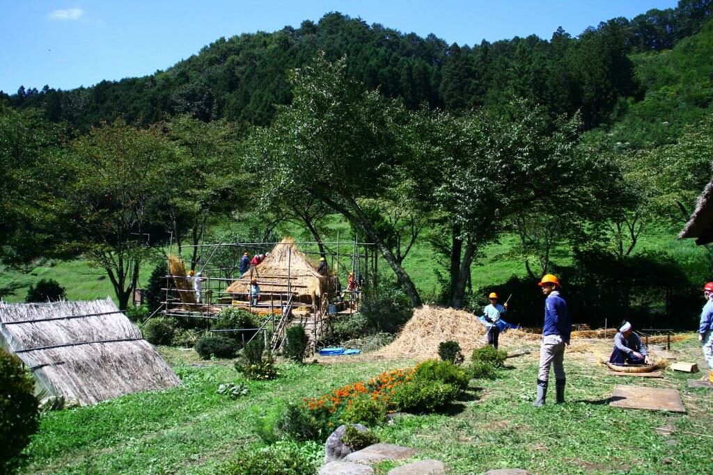 里山塾では「茅葺き」や「地域」に特化した専科コースも開催しております。今回は、現役の茅葺き職人さんから学べる「屋根葺き」の専科コースの開催です。数年前から取り掛かっているこの屋根も、立派な形に仕上がってきました。それと同時に、屋根の最上部である「棟」に必要な様々な材料も、茅でこさえていきます。4人同時に息を合わせて「ミノ茅」を作ったり、しゅろ縄を均等な間隔で「ギュッ」と巻いていく「マキワラ」を作ったり・・・。単純作業ですが、ひとつの動作に知恵や技がたくさん詰まっています。講師である茅葺き職人さんのお話に関心しながら、貴重な体験を楽しんでいただきました。