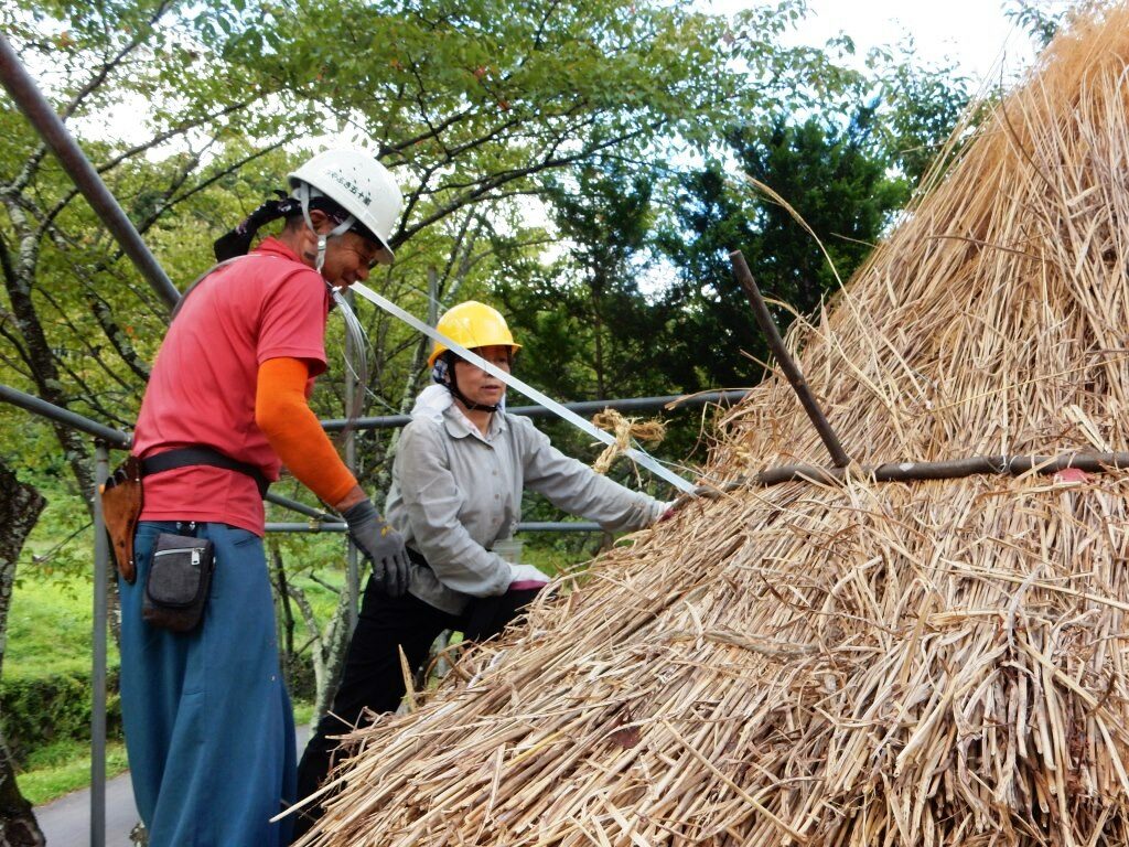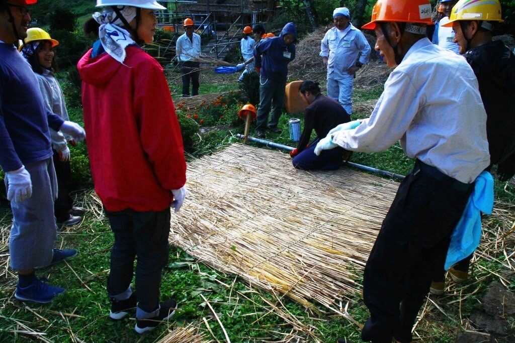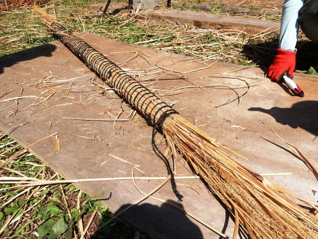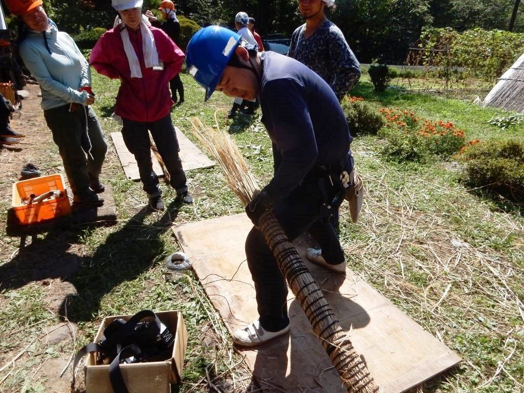 里山塾では「茅葺き」や「地域」に特化した専科コースも開催しております。今回は、現役の茅葺き職人さんから学べる「屋根葺き」の専科コースの開催です。数年前から取り掛かっているこの屋根も、立派な形に仕上がってきました。それと同時に、屋根の最上部である「棟」に必要な様々な材料も、茅でこさえていきます。4人同時に息を合わせて「ミノ茅」を作ったり、しゅろ縄を均等な間隔で「ギュッ」と巻いていく「マキワラ」を作ったり・・・。単純作業ですが、ひとつの動作に知恵や技がたくさん詰まっています。講師である茅葺き職人さんのお話に関心しながら、貴重な体験を楽しんでいただきました。