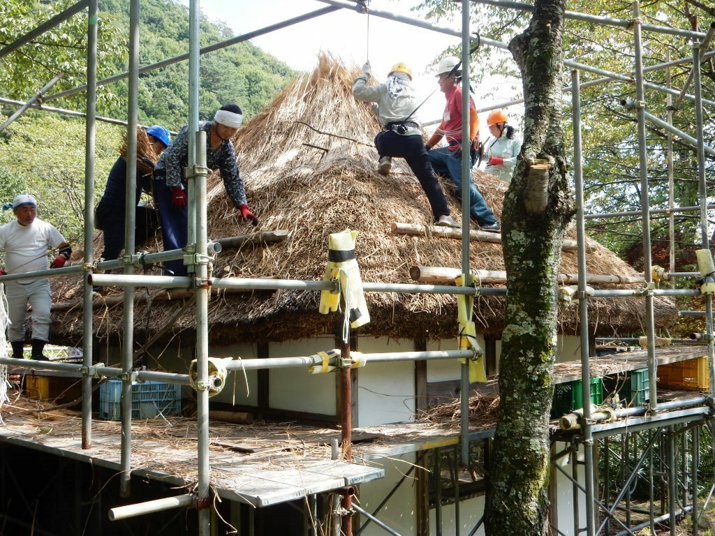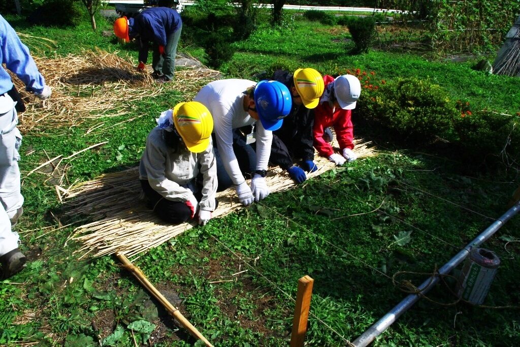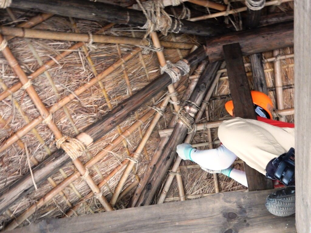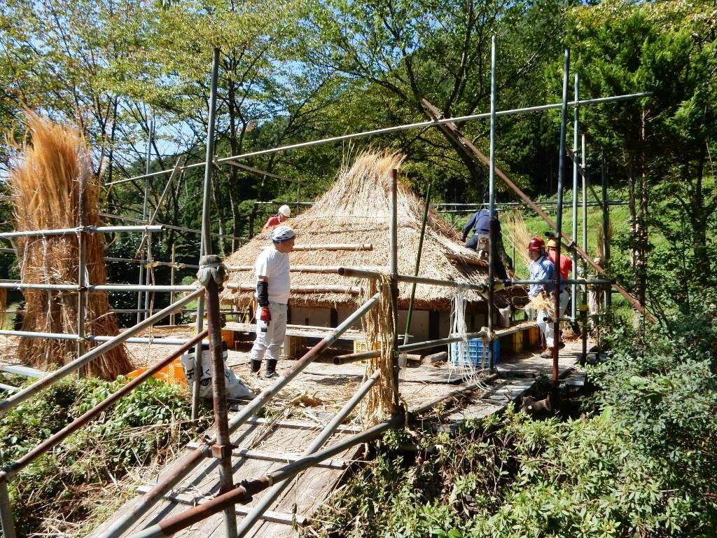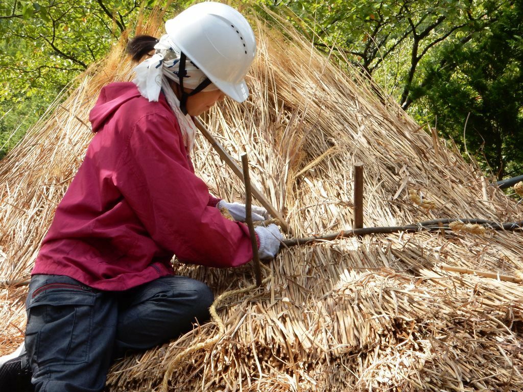 里山塾では「茅葺き」や「地域」に特化した専科コースも開催しております。今回は、現役の茅葺き職人さんから学べる「屋根葺き」の専科コースの開催です。数年前から取り掛かっているこの屋根も、立派な形に仕上がってきました。それと同時に、屋根の最上部である「棟」に必要な様々な材料も、茅でこさえていきます。4人同時に息を合わせて「ミノ茅」を作ったり、しゅろ縄を均等な間隔で「ギュッ」と巻いていく「マキワラ」を作ったり・・・。単純作業ですが、ひとつの動作に知恵や技がたくさん詰まっています。講師である茅葺き職人さんのお話に関心しながら、貴重な体験を楽しんでいただきました。