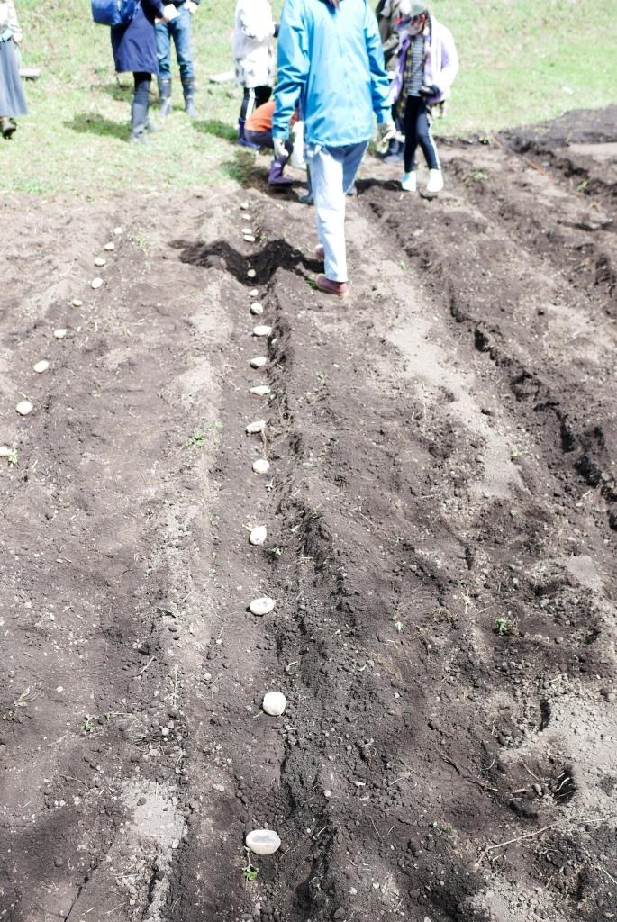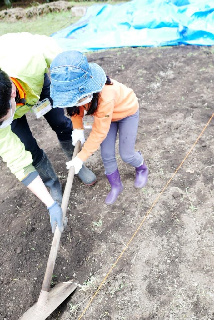 今回は、「野良(畑)仕事」で野菜の作付けと、「やま仕事」で木を植える体験をしていただきました。畑で使う「板くわ」と、やまで使う「とうぐわ」・・・。同じ「くわ」でも、植えるものによって使い分けています。初めて使う道具に苦戦しながらも、土と戯れていた子どもたちは、元気いっぱいです。そんな皆さんのように、植えた野菜や木が、元気いっぱいに育ってくれるといいですね。