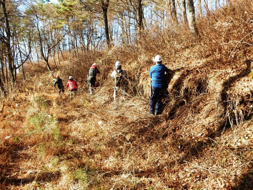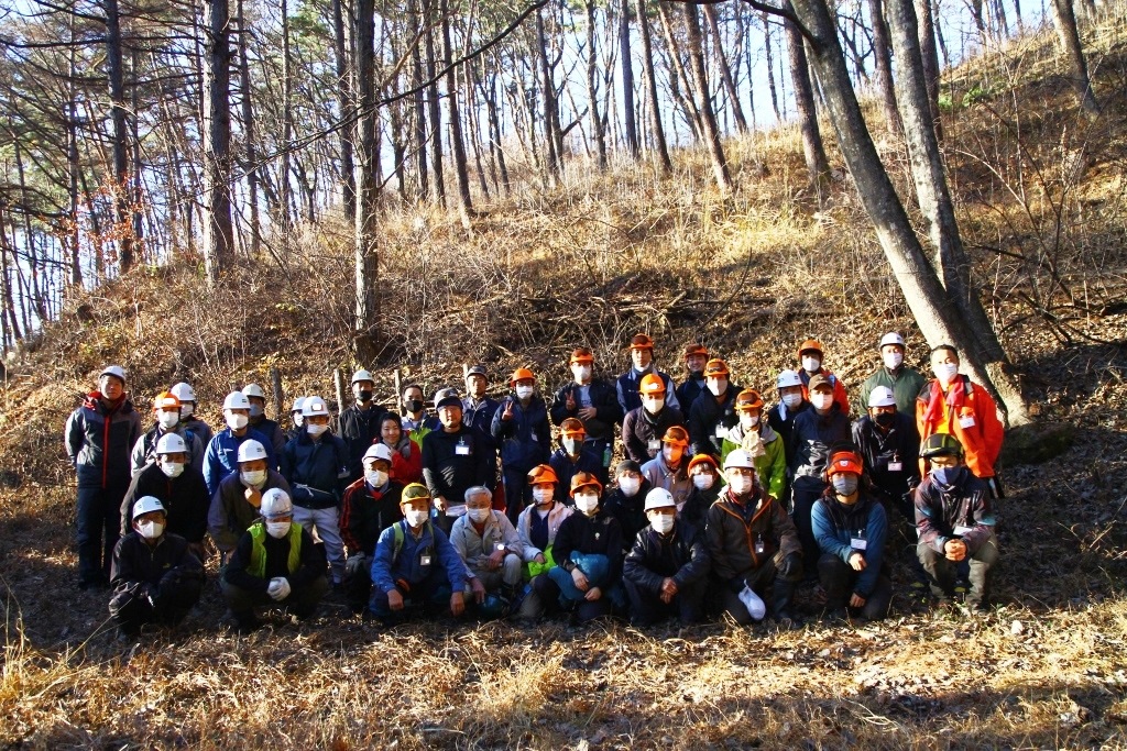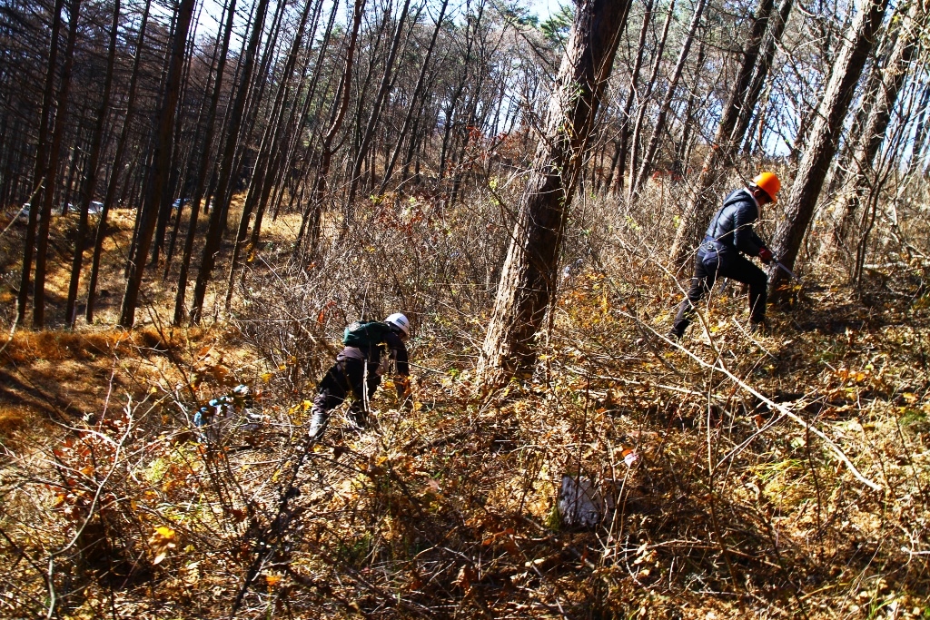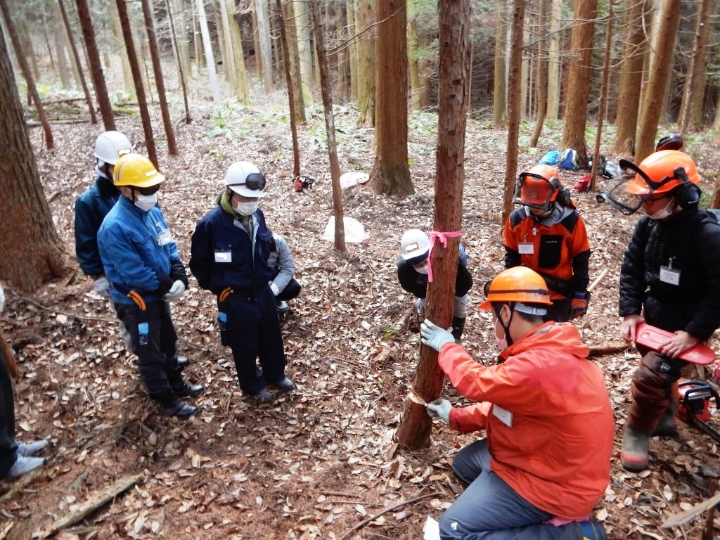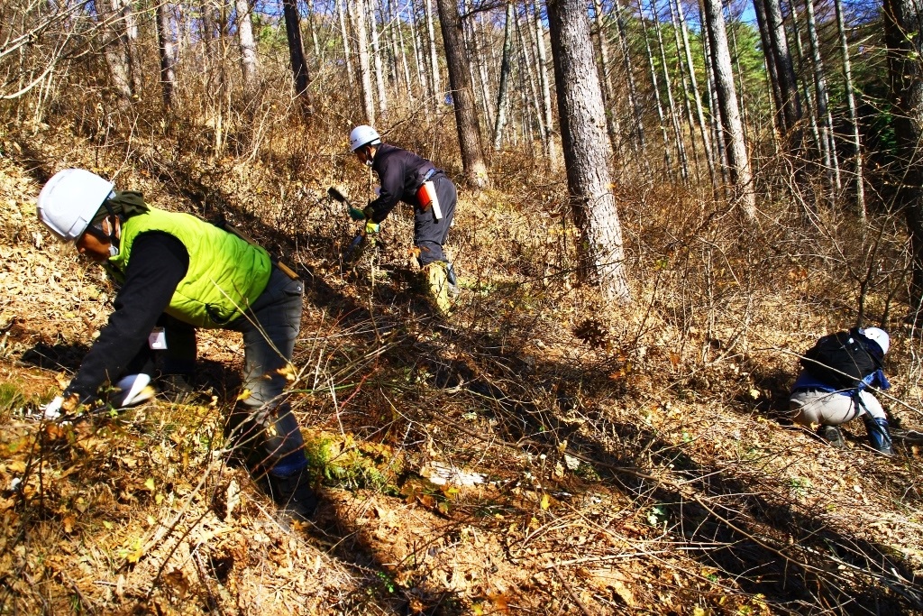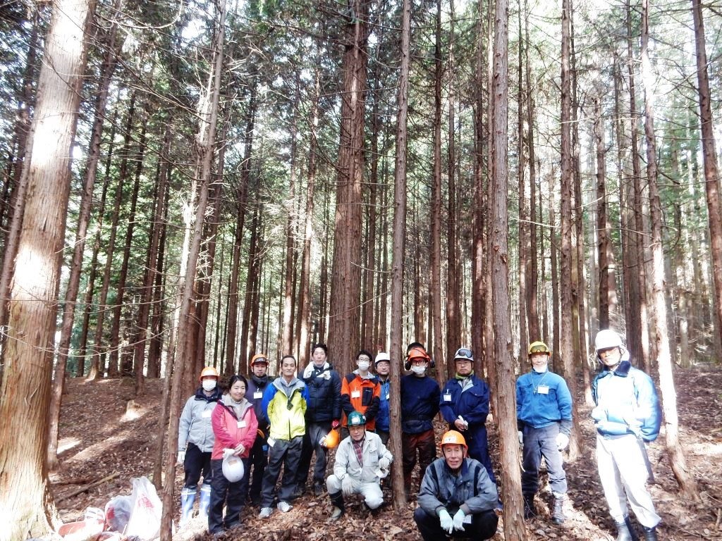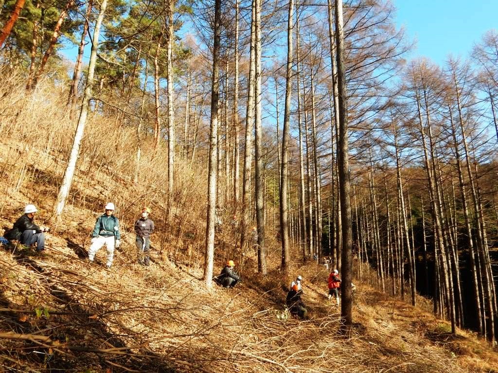 今年度の最終回は、地域に特化した専科コースの開催です。里山塾では、毎年地元の方々と一緒に山の手入れをしておりますが、今回は昨年に引き続き、カラマツ林の除伐作業を行いました。これだけの人数が山に入るわけですから、森が綺麗になるのはもちろんのこと、獣害対策にも繋がります。ともに汗を流し、作業の合間には話も弾み、交流を深めていただいた様子でした。また2日目は、10月に目印した木を間伐しました。ヒノキは枝がしっかりしていて、伐倒作業は大変でしたが、明るくなった森からも達成感を味わっていただきました。