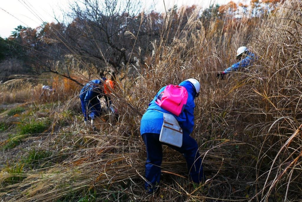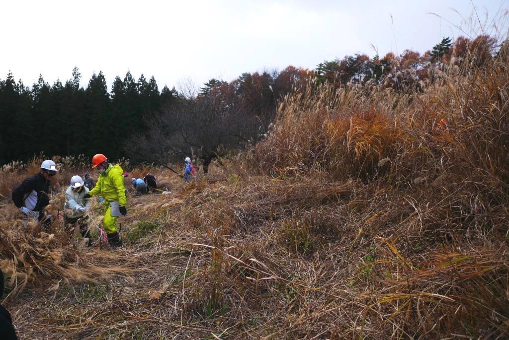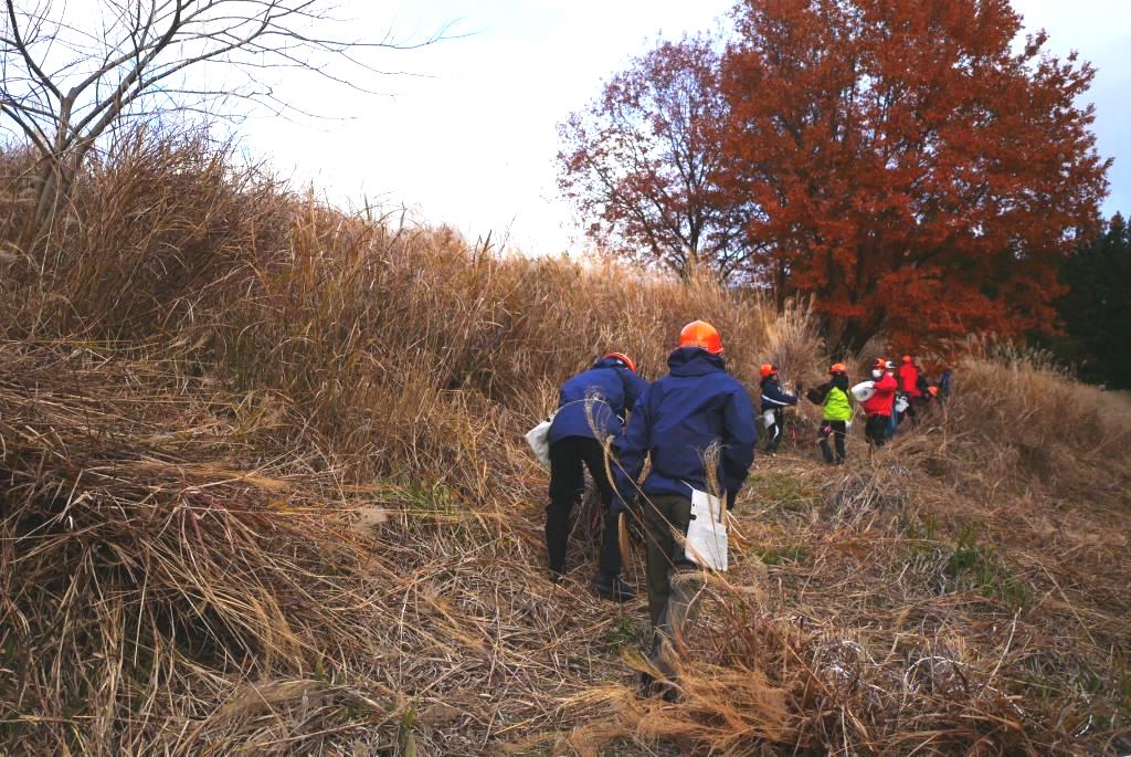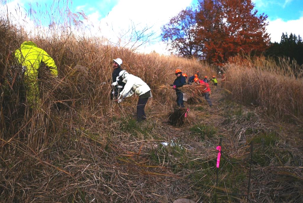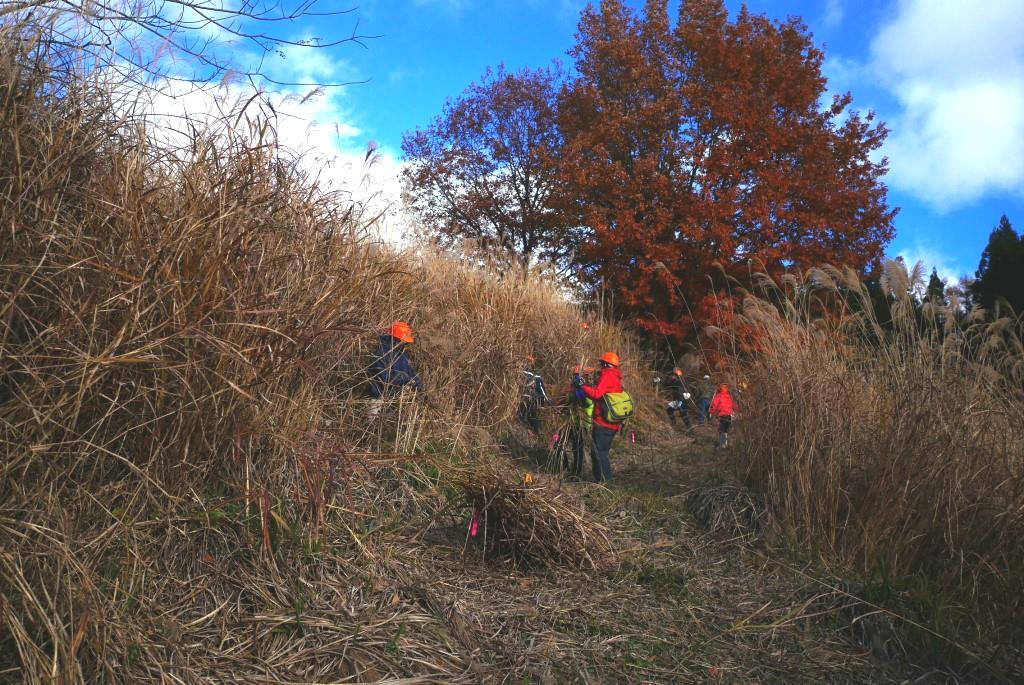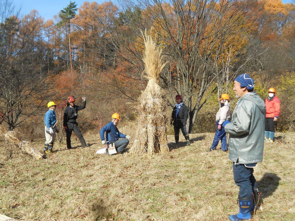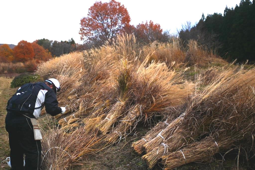 今回は、おとなの里山コース・茅葺きコース合同で、ススキの収穫「茅刈り」です。この茅場は平成18年度にスタートした茅葺塾の時から整備してきましたが、毎年刈り取り続けてきたことで、良質な茅場となってきました。そして、現役茅葺き職人の五十嵐講師からも、お墨付きをいただくほどとなりました。だからこそ、たくさんの茅を収穫して、塾の実践だけでなく、村内や世田谷区内の施設で活用されると嬉しいですね。大変な作業でしたが、合間には生芋からの手づくり蒟蒻や、旬なリンゴをおやつに、この時期の里山をお楽しみいただきました。