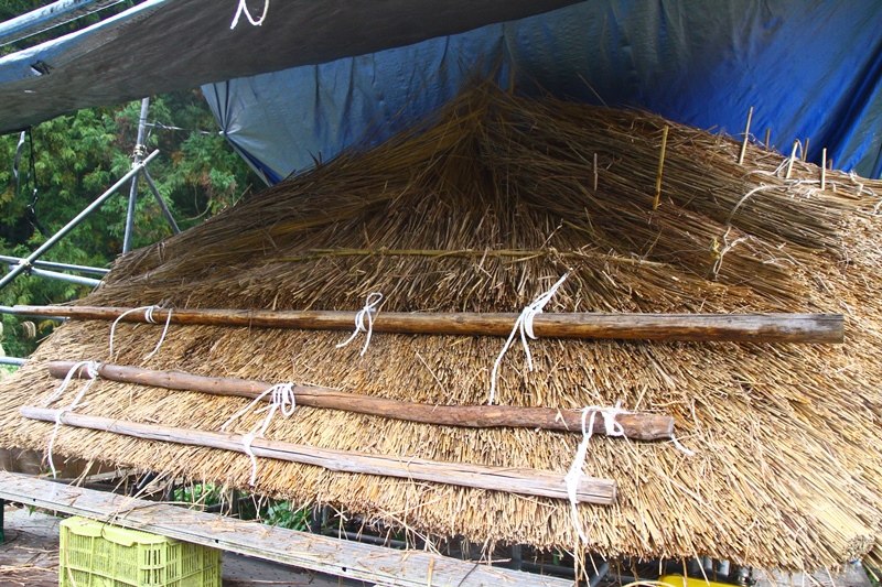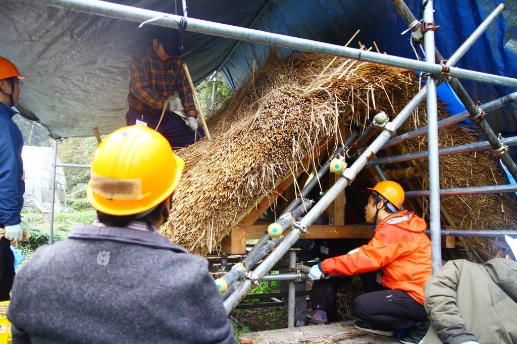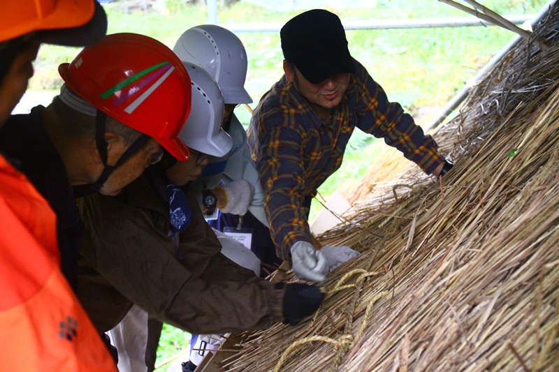 茅葺きコースでは、講師である現役茅葺き職人によるお手本から始まり、熟練の手さばきで茅を美しく葺き上げる職人技に、思わず見惚れてしまいます。皆さん講師から丁寧な手ほどきを受けながら、少しずつ茅が屋根の形を成し、感動と心に残る体験の記憶が刻まれました。