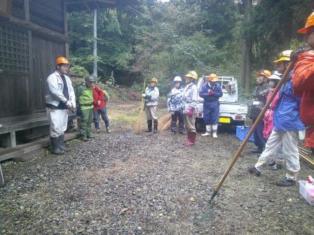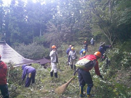 初日は、村内の冨士山(ふじやま)集落に出かけ、地元の方と一緒に遊歩道の清掃を行いました。落ち葉や枝を取り除く慣れない作業に汗を流しながらも、少しずつ道がきれいになっていく様子に、大きな達成感を感じることができました。