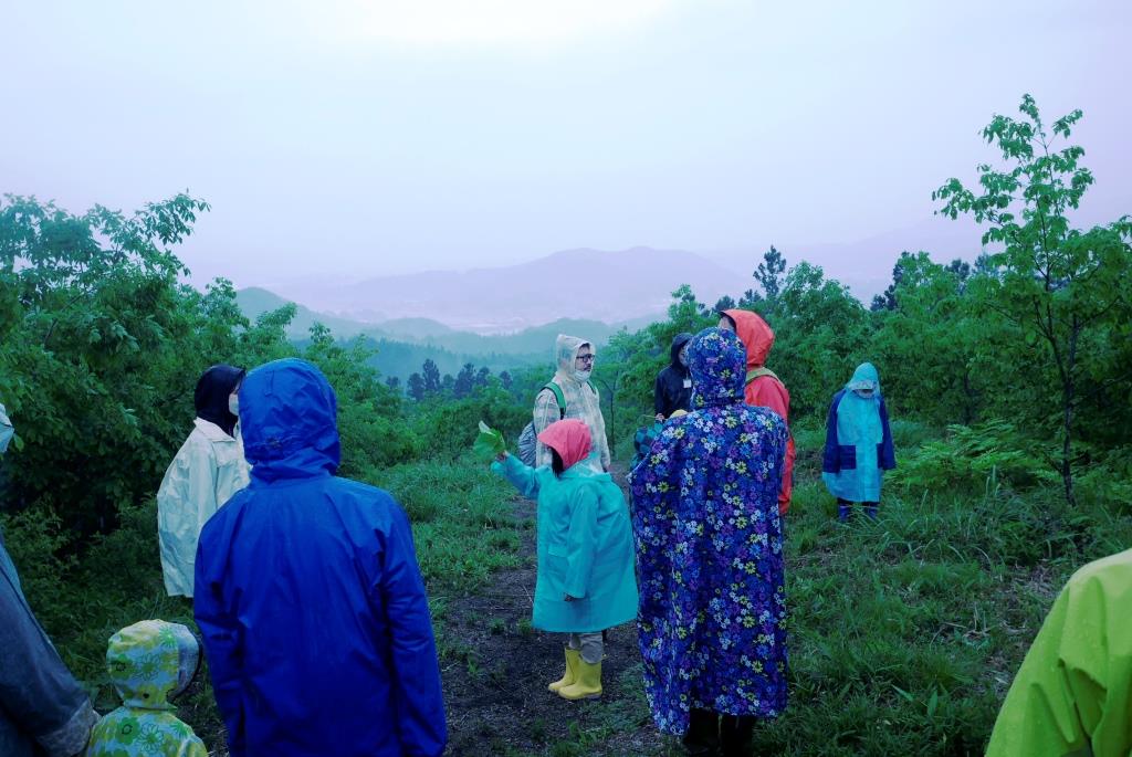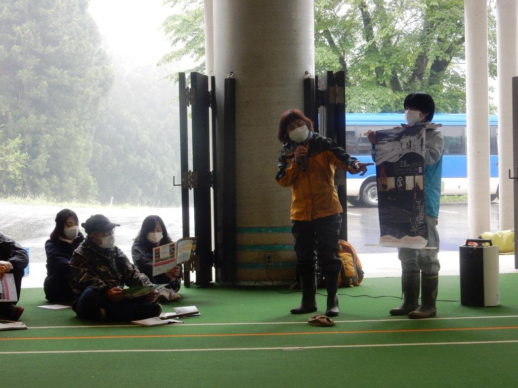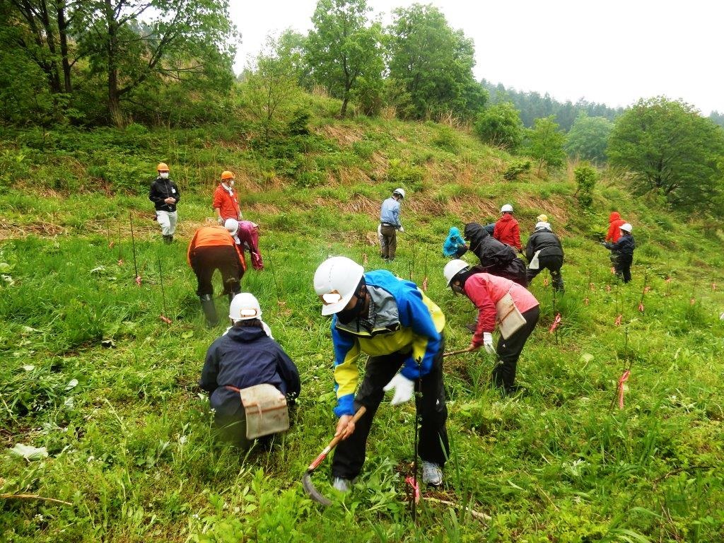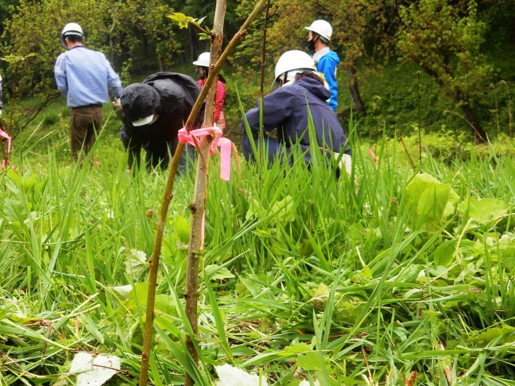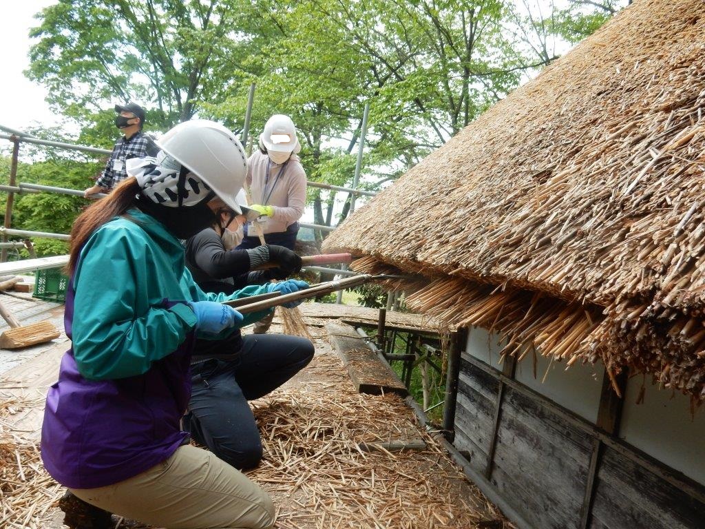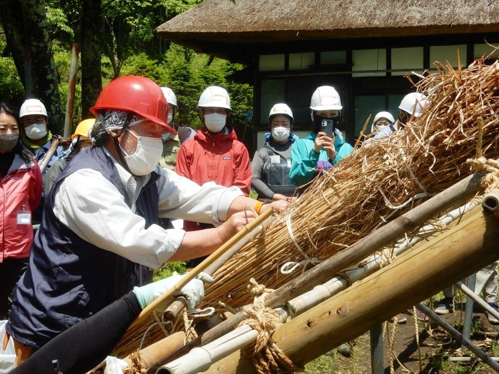 今回は、村内の冨士山(ふじやま)集落に出かけて、地元の人と一緒に遊歩道整備を予定しておりましたが、いざ出発というところで雨が強くなり、残念ながら作業は中止となってしまいました。しかし、地元の方にお越しいただき、冨士山集落のお話を聞いたり、4月に植えた場所の草刈りをしたりと、悪天候ながらも充実した時間となりました。また、2日目には伝統的な「茅葺き」を体験しました。里山塾では、現役の茅葺き職人さんが講師となり、茅葺きの技術を学ぶことができます。ユネスコ無形文化遺産にも登録され、注目が集まる伝統的な技術は、とても貴重な経験になると思います。