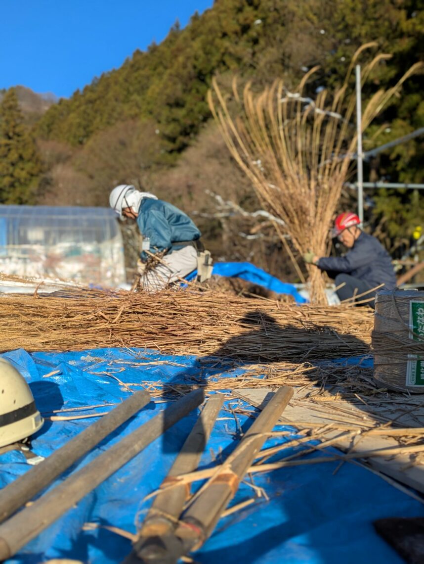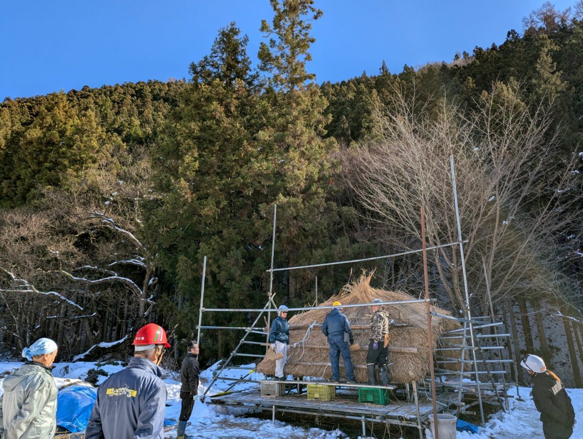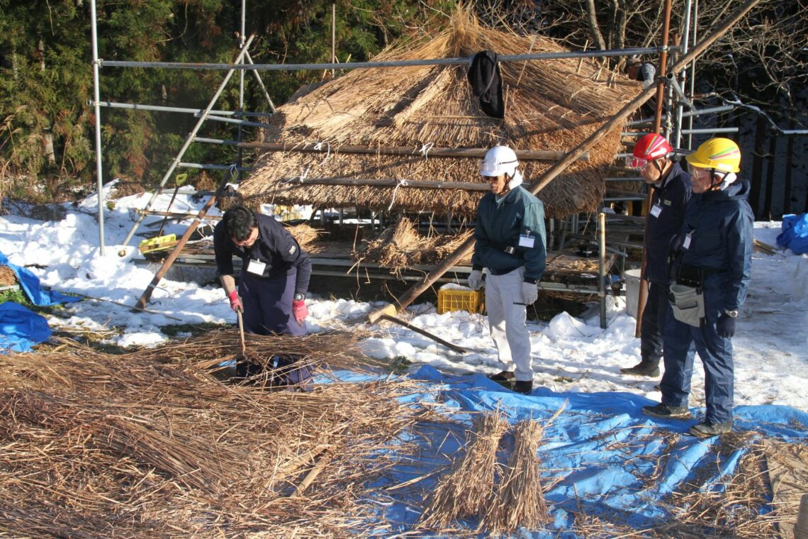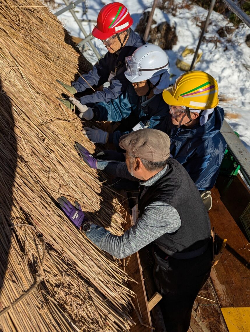 10月に続き茅葺きに挑戦です。今回は雪景色の中、冷たい空気に包まれながらも、参加者の皆さんは寒さに負けず、真剣な眼差しで茅葺き作業に取り組んでいました。 現役茅葺き職人の講師から丁寧な手ほどきを受けながら屋根葺きを進めると、少しずつ屋根の形になってきました。今年度のコースは終了となりましたが、来年度の茅葺きコースで完成を目指しております。